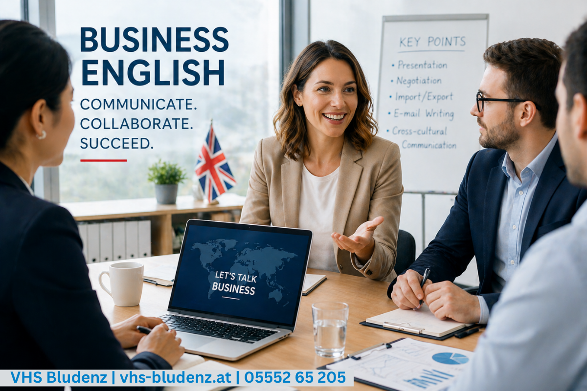 Die Volkshochschule Bludenz bietet im Bereich Business English praxisnahe Trainingsformate für unterschiedliche Anforderungen. Im Fokus steht nicht nur Sprache, sondern deren gezielte Anwendung im beruflichen Kontext – abgestimmt auf Branche, Funktion und Erfahrungsniveau.